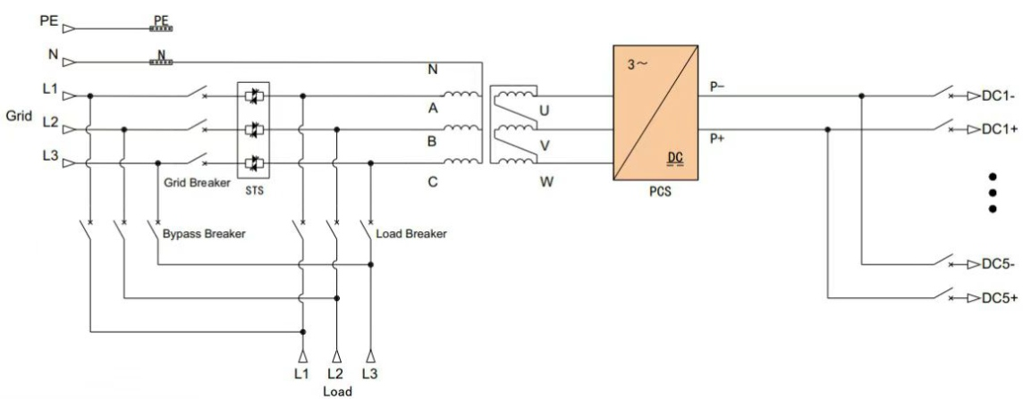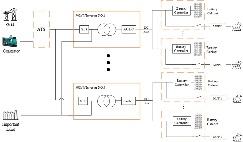 1.500 kW க்கும் அதிகமான சுமைகள், ஒரு பெரிய-திறன் 500 kW ஒற்றை-அலகு ஆற்றல் சேமிப்பு இன்வெர்ட்டரைப் பயன்படுத்த பரிந்துரைக்கப்படுகிறது, இவை நான்கு செட் இணை இணைப்புகளை ஆதரிக்கும் திறன் கொண்டவை, மொத்த மின் உற்பத்தி 2 MW;